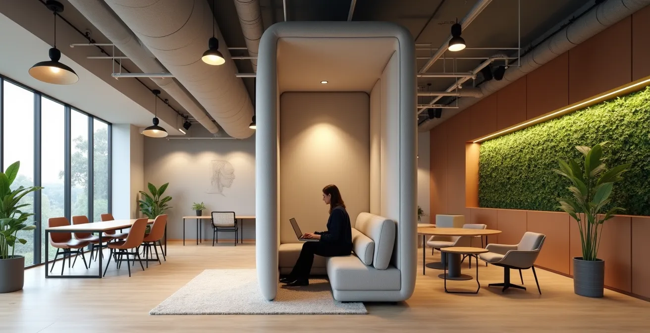 | Focus Zone | 40-45 dB | Individual work | Semi-enclosed pods, ceiling baffles |